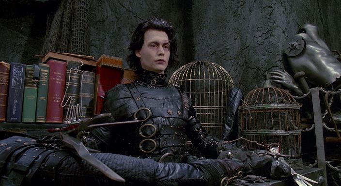 Едварда створює самотній учений, але він помирає, не встигнувши доробити своє творіння, тож у хлопця замість рук залишилися ножиці. Одного дня представниця косметичної компанії Пег випадково знайшла Едварда, запросила його в свою родину і почала знайомити з довколишнім світом. Через свої руки-ножиці Едвард незграбний, але майстерно робить зачіски та різноманітні фігури з кущів. Хлопець закохується у доньку Пегі Кім, яка, попри його інакшість, відповідає Едвардувзаємністю. Та не всім припав до душі новий сусід Едвард, тож популярність обертається недовірою та ненавистю.