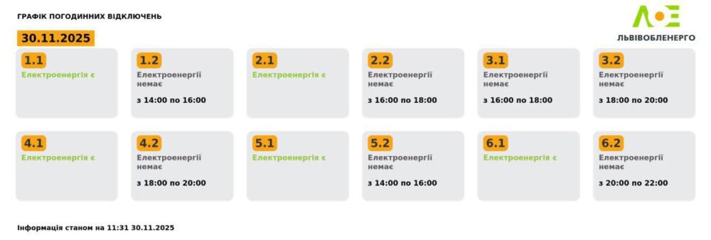 Львівобленерго опублікувало оновлений графік погодинних відключень електроенергії на 30 листопада.