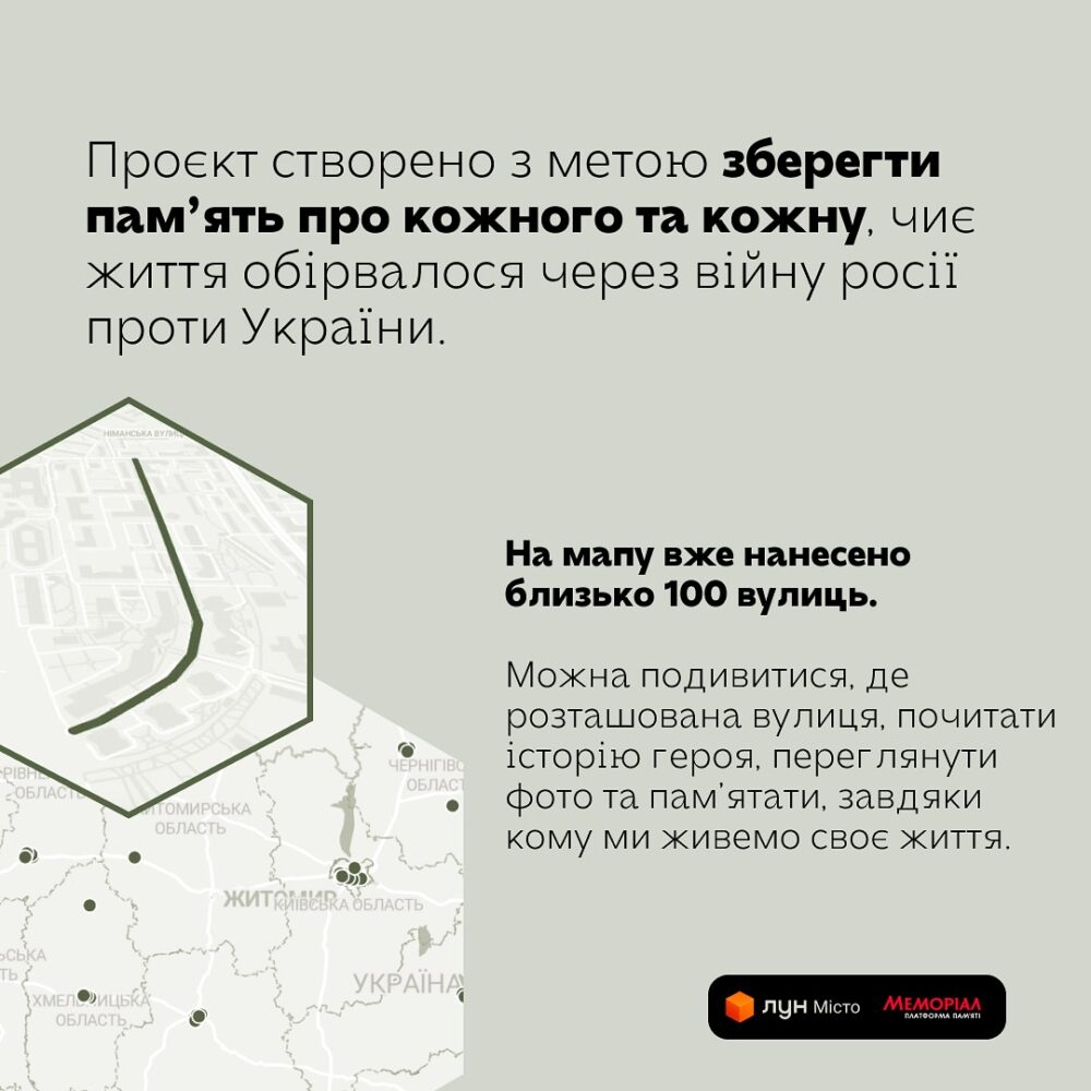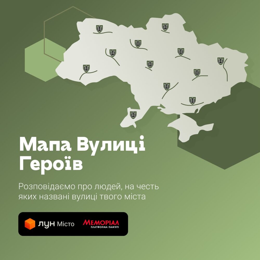 Платформа пам’яті «Меморіал героїв» у співпраці з IT-компанією ЛУН розробили інтерактивну мапу, на якій вказали назви вулиць, присвячені полеглим українським військовим, повідомляють на Facebook-сторінці ЛУН.