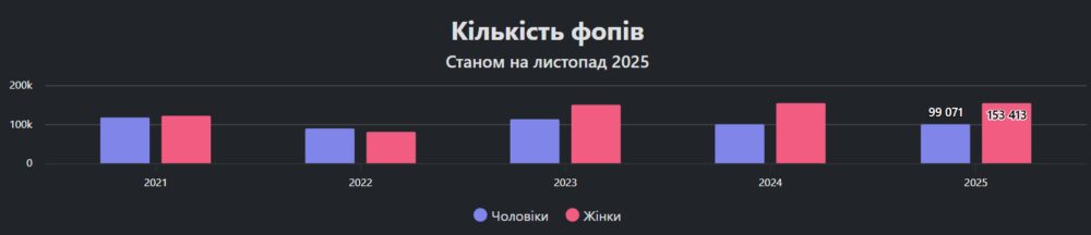 Якщо брати в кількісному значенні, то станом на листопад 2025 року в Україні на жінок зареєстровані 153 тисячі ФОПів, а на чоловіків 99 тисяч (у 2021-му – 121 тисяча та 116 тисяч відповідно). До слова, на Львівщині жінки відкрили понад 11 тисяч ФОПів, за цим показником наша область займає п’яту сходинку після Києва, Дніпропетровщини, Одещини та Київської області.