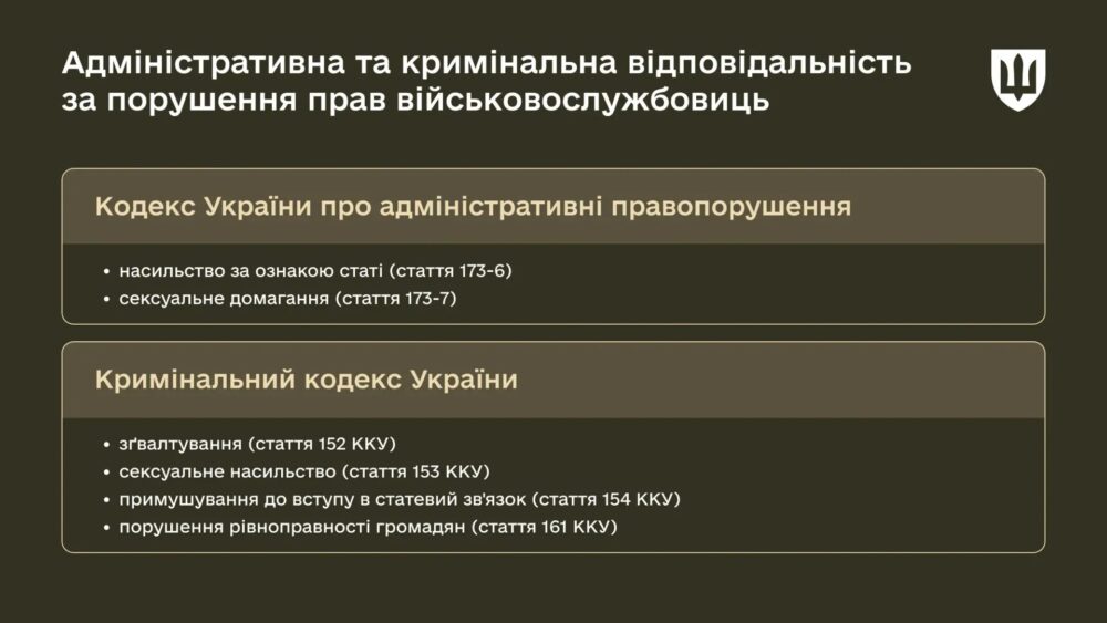 «Не всюди так, проте мені «щастило» потрапляти саме в такі ситуації. Тепер я перевелася в частину, де ставлення до військовослужбовиць дуже непогане в розумінні реалізації, навчання і роботи. І хоч цей досвід я запам’ятала на все життя, він мене не зламав, я стала лише сильнішою і впевненішою, як би банально це не звучало».