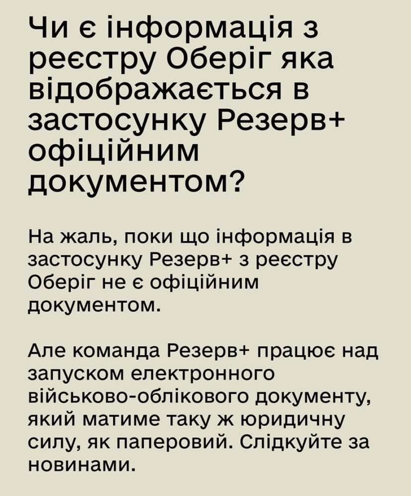 Свою персональну інформацію оновити можна, зокрема, у застосунку Резерв+. Він доступний у Google Play та App Store. Крім того, у гьому будуть доступні дані військовозобов’язаних з реєстру «Оберіг».