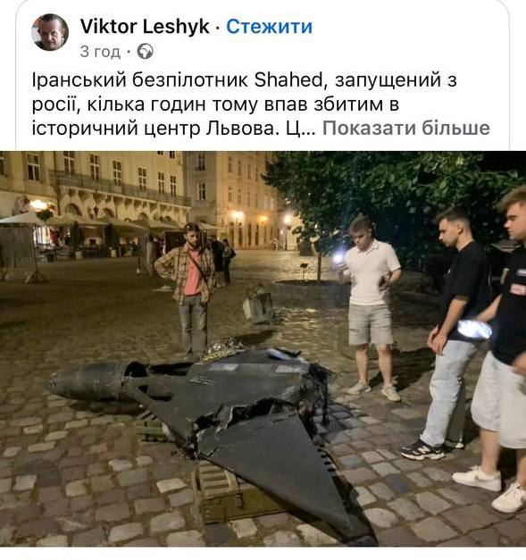 У соцмережах поширювали повідомлення про нібито падіння «Шахеда» внаслідок Площі Ринок, однак ця інформація не відповідає дійсності. Фото, яке використовували у фейкових дописах — архівне і було зроблене раніше на виставці.