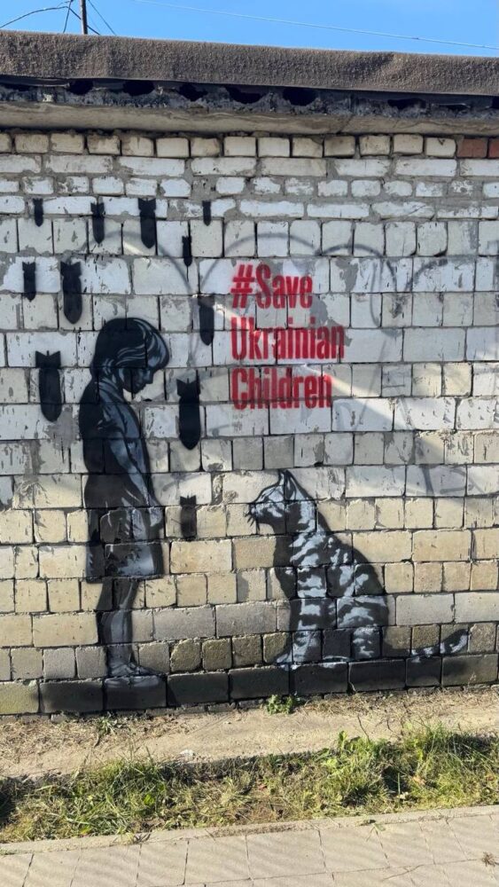 На муралі зображеного силует дитини на яку споглядає дорослий кіт через призму падаючих бомб.