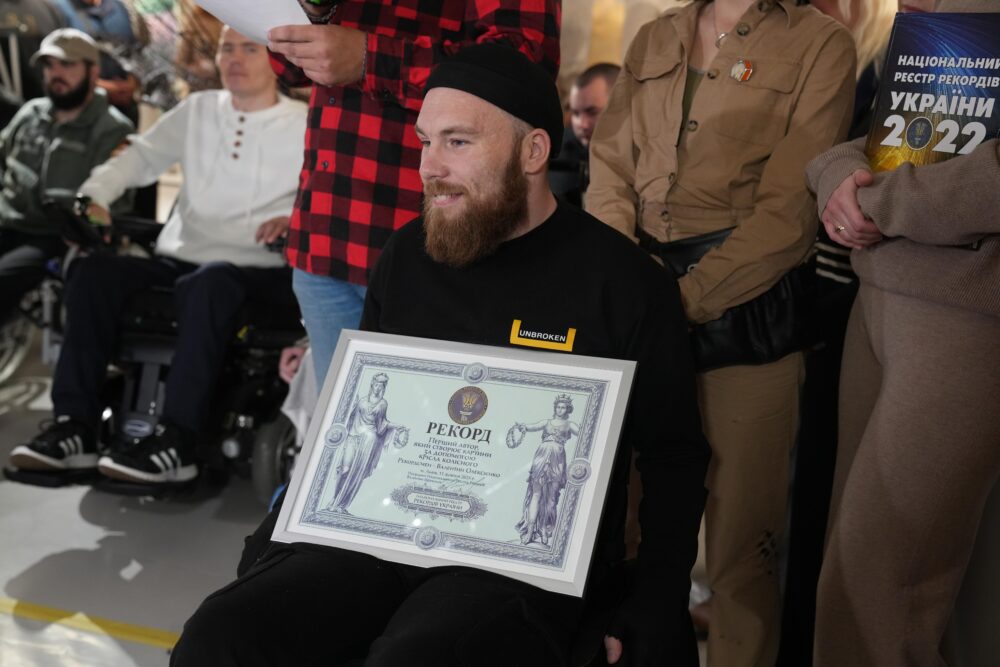 28-річний військовий Валентин Олексієнко, який проходить реабілітацію у Центрі UNBROKEN у Львові, встановив мистецький рекорд України — він створив картину, використовуючи колеса свого крісла колісного.